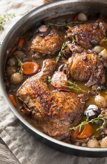 12. Schep de Coq au Vin op een schaal en strooi er peterselie over.